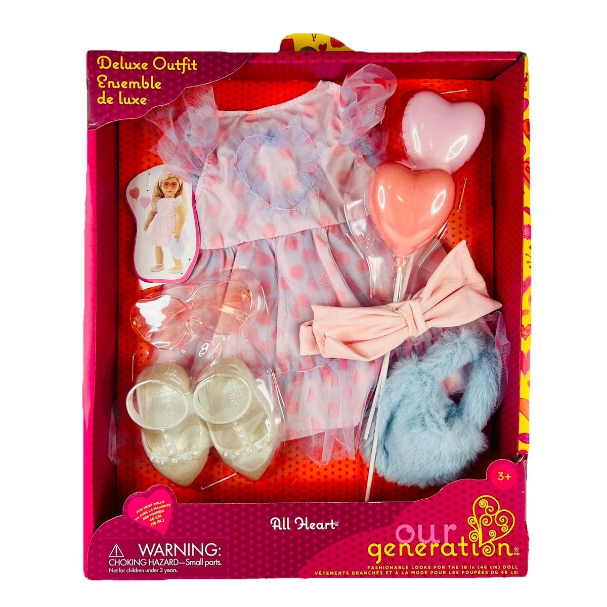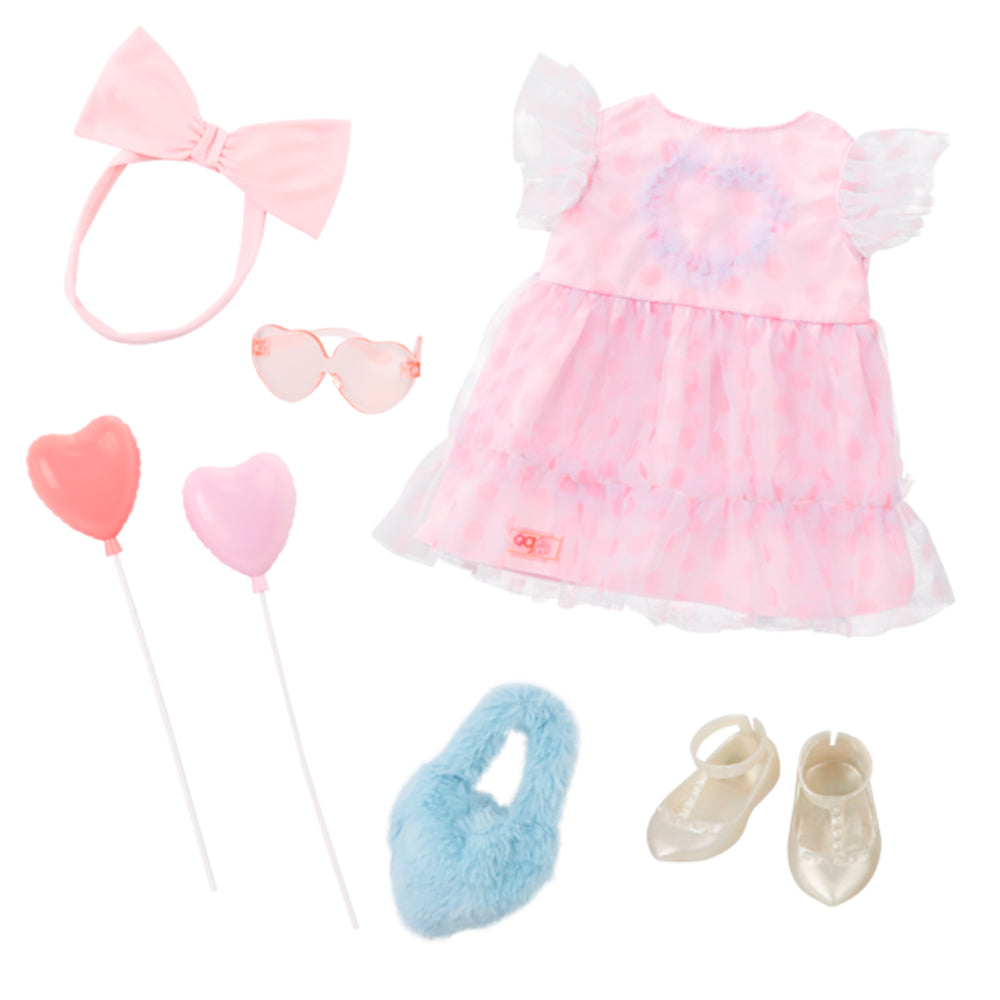 Celebrate fun times in sweet style with the Our Generation All Heart outfit for 18-inch dolls! Ready to party? This cute clothing set includes a ruffle tulle dress decorated with pink dots, perfect for their next festive celebration. Plus, it also comes with extra accessories like a pink bow headband, heart-shaped sunglasses, a faux-fur purse, and 2 balloons to complete the look and add to the storytelling. When it's time for dress-up, this 18-inch doll outfit has easy-open closures to quickly put on and remove. So kids can mix, match, and create more stylish looks as they explore imagination and self-expression.