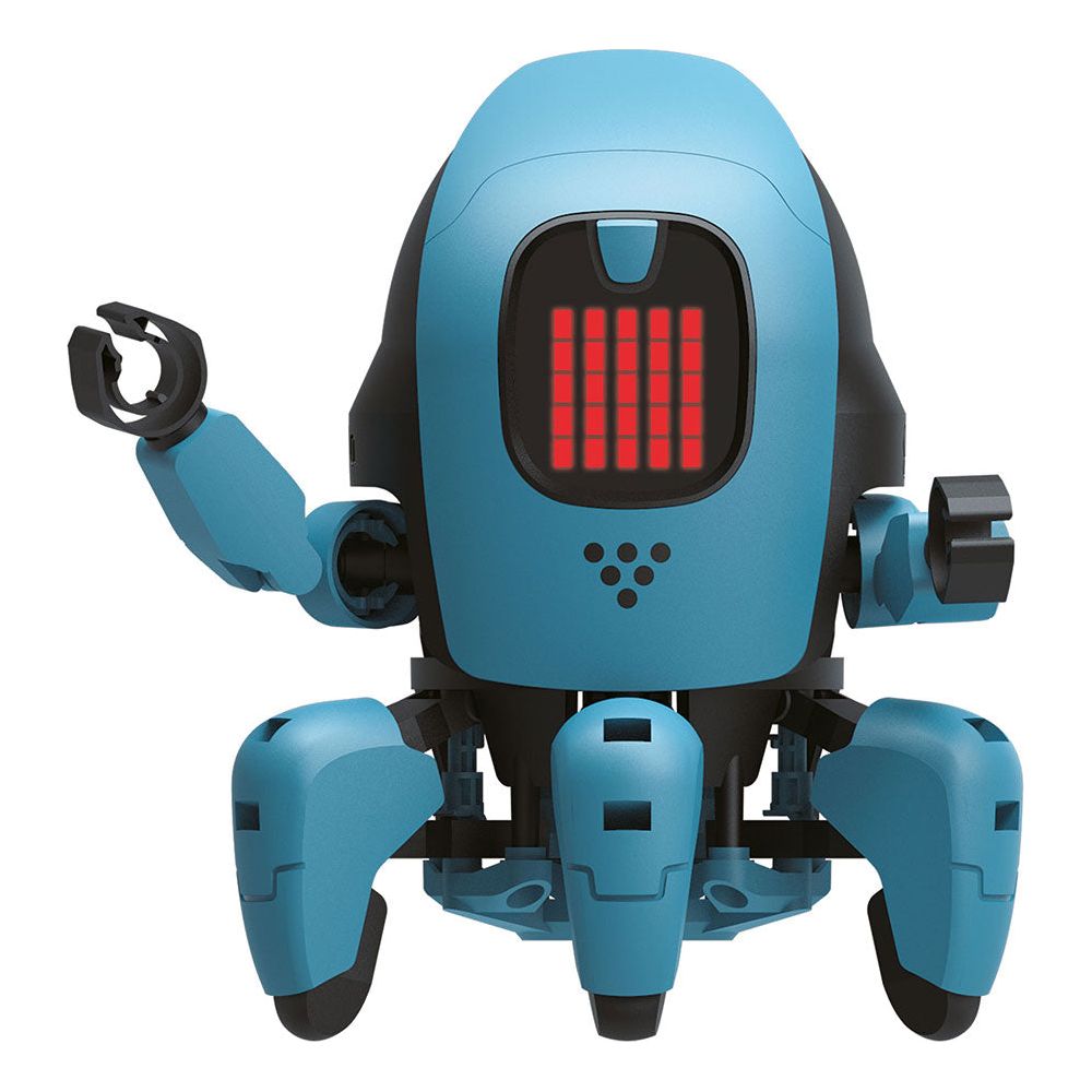 Mechanically, KAI is a fascinating robot that can walk on six legs and rotate its upper body around 360 degrees, allowing it to turn toward any direction on the spot. Composed of 25 red LEDs, its face display can be programmed via the app to show different expressions and scrolling messages.