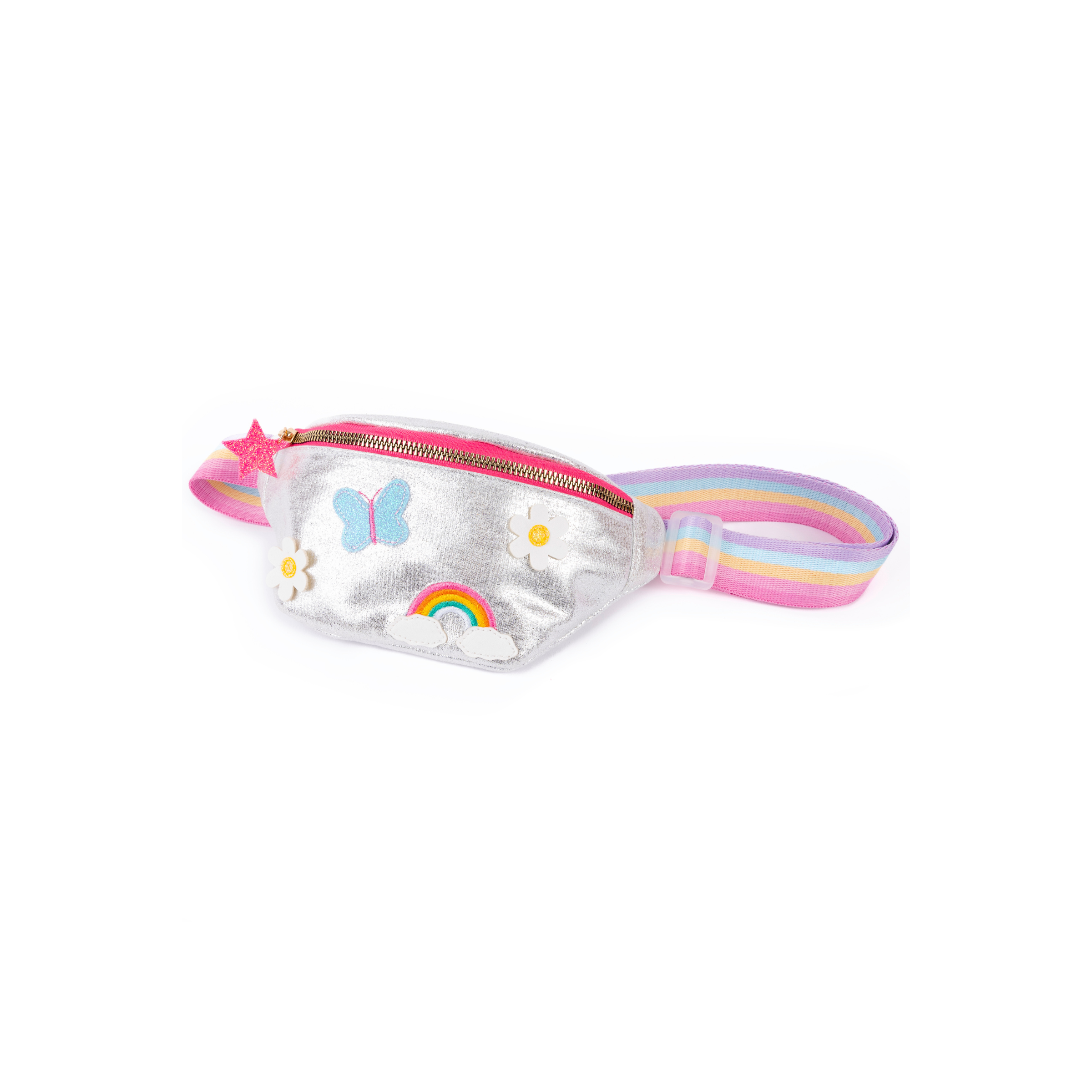 Meet your new go-to accessory: the Rainbows & Butterflies No Compromise Fanny Pack! Bursting with personality and charm, this metallic silver fanny pack is as functional as it is fabulous. The shimmering finish gives it a futuristic, fashion-forward feel, while the playful front design—featuring a colorful rainbow, butterfly, and flower—adds a touch of nature-inspired magic.