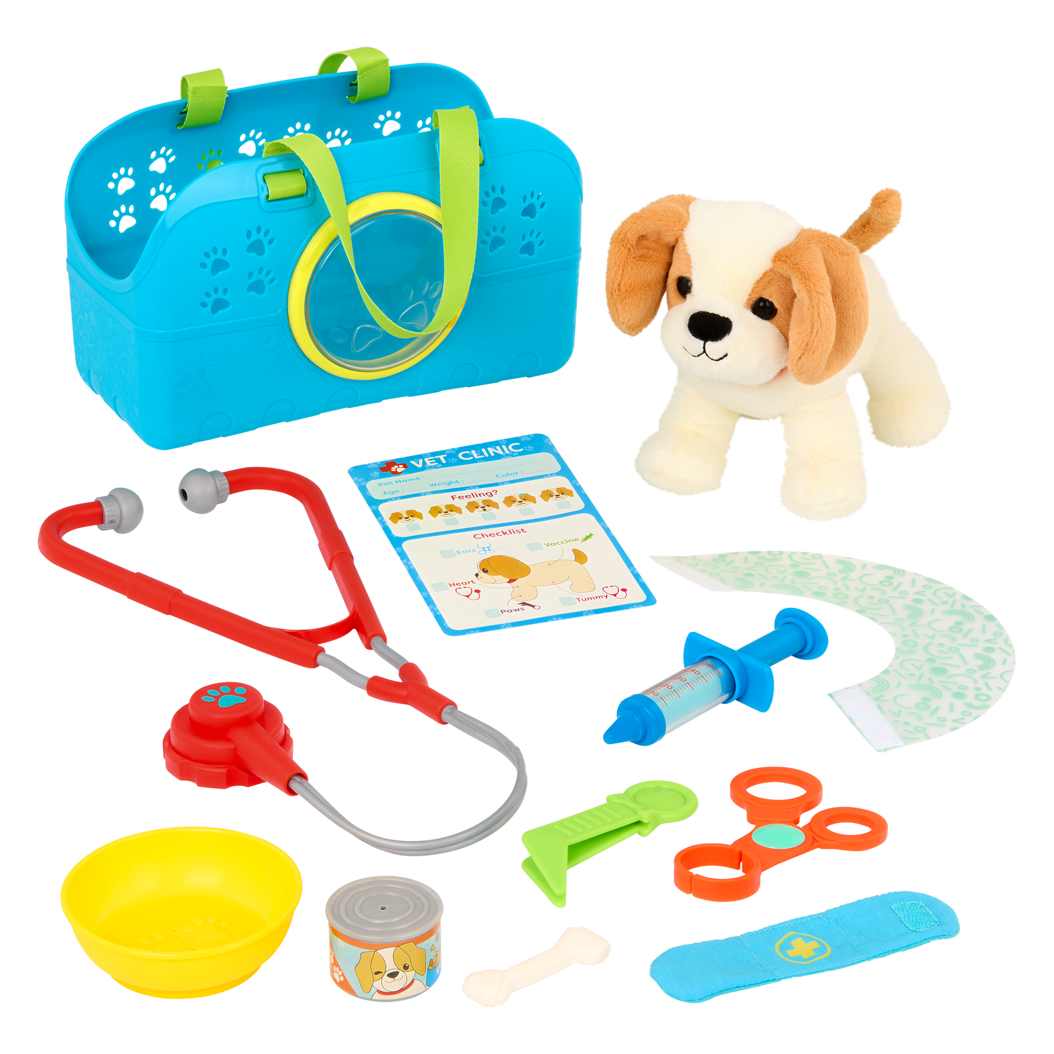 Turn into a veterinarian with the Happy Puppy Vet Set from Battat! This 11-piece vet kit encourages nurturing play thanks to its adorable plush pup and medical accessories. Does the puppy have a cold? Use the toy stethoscope to listen to the pup’s heartbeat! Got an ouchie? Apply the soft bandage. Also included is a pet cone, forceps, tweezers, a toy syringe, and a checklist for more vet play opportunities. Feeling better? Feed the dog the can of food and treat it to a bone. Then, put your plush pet into its carrier for adventures on the go! Playing with stuffed animals and medical toys sparks the imagination and encourages empathy.