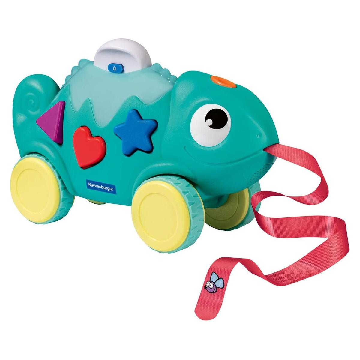 Welcome to the jungle! This cheerful chameleon will be a cute first friend packed with playful learning fun that grows with your child. This shape-sorter toy features lights and sounds that are activated as little ones play. They will love to hear fun tunes and watch the lights change when they press the small button on the chameleon’s head or one of the shapes on its sides. The six chunky shapes are ideal for shape-sorting play, and the 4 in 1 Colour and Shape Sorter Chameleon features three sorting games that build in challenge as your child grows. Along the way, they’ll learn about colours and shapes while practicing fine motor skills. Each shape placed correctly activates a different light pattern and tune. A handy locking function keeps the shapes in place when that’s best - no more rooting around the bottom of the toy box for those missing shapes! And when your little one takes their first steps, the cute chameleon can be used as a pull-along toy with his soft ribbon tongue. His sturdy rubber wheels are suitable for all floor types, so journeys through the jungle are no trouble with this friendly chameleon.