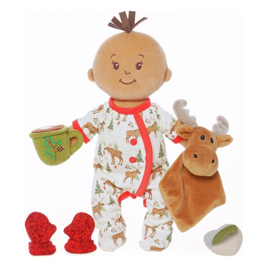 This delightful doll has a beautiful beige skin tone, oval-shaped eyes, a brown fabric hair tuft, and a removable cream onesie with a woodland animal print. Play accessories include a pair of knit mittens, a cup of hot cocoa, and a moose blankie. The cup and blankie have an elastic strap for attaching to the doll's hand.