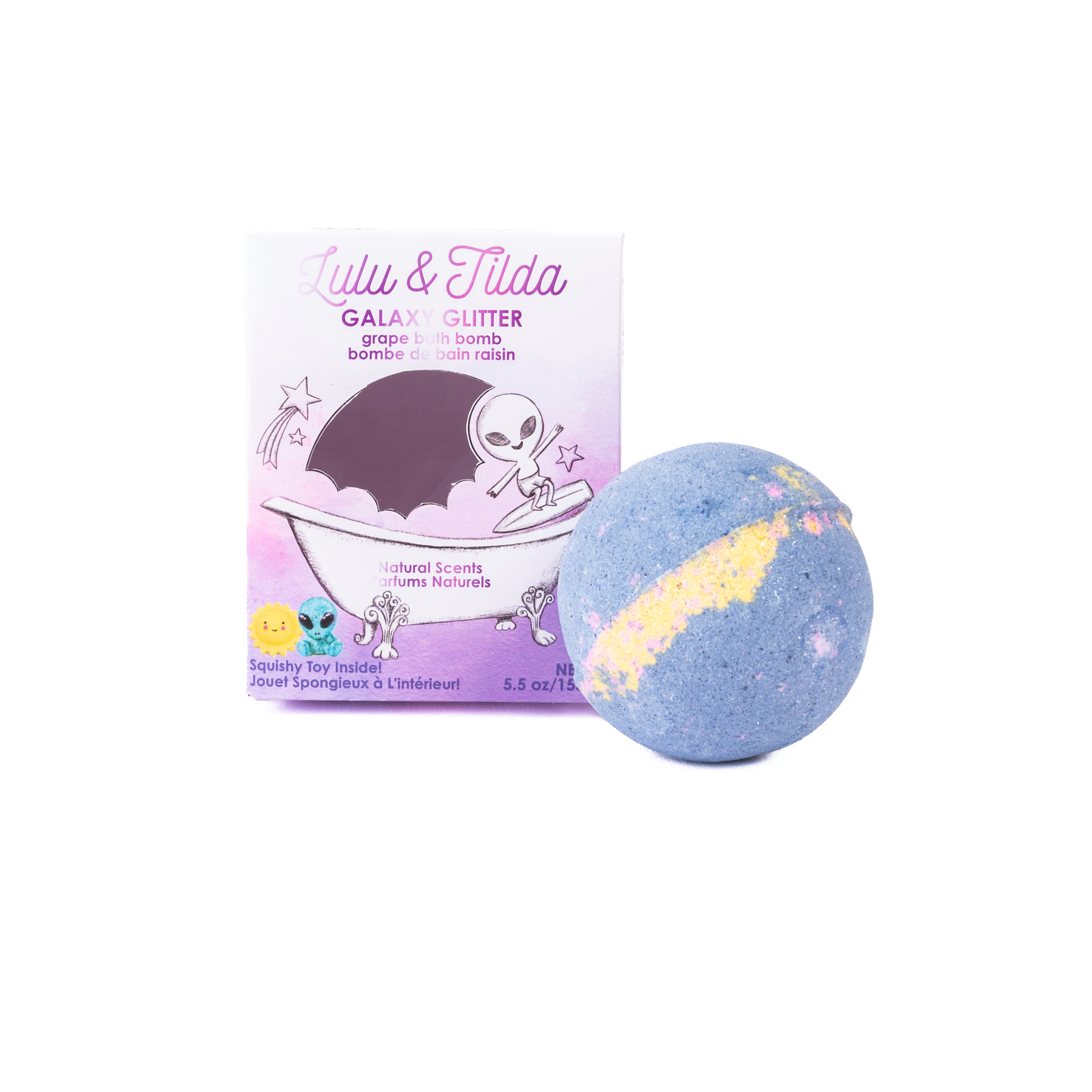 Embark on an intergalactic adventure with the Galaxy Glitter Bath Bomb! Bursting with a sweet galaxy grape scent, this bath bomb transforms bath time into a cosmic escape. Crafted with nourishing natural ingredients, food-grade colorants, and biodegradable sparkle, it’s safe and gentle for young explorers. Plus, each bath bomb hides an out-of-this-world surprise—a squishy Alien or radiant Sun Squishy waiting to be discovered!