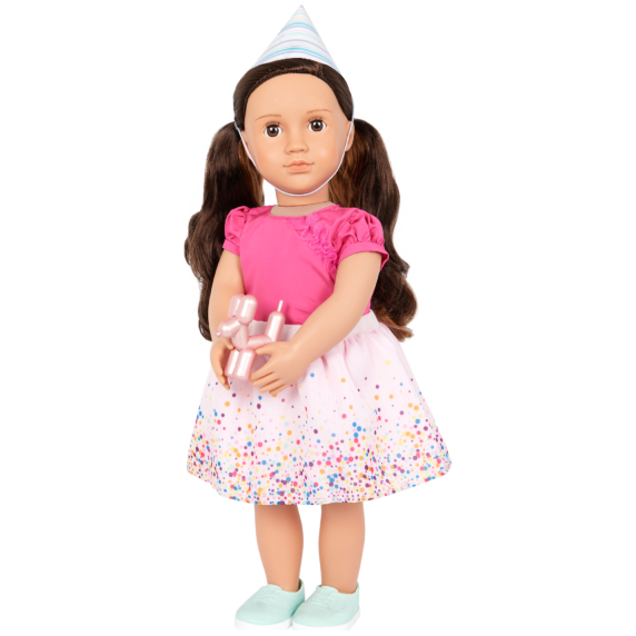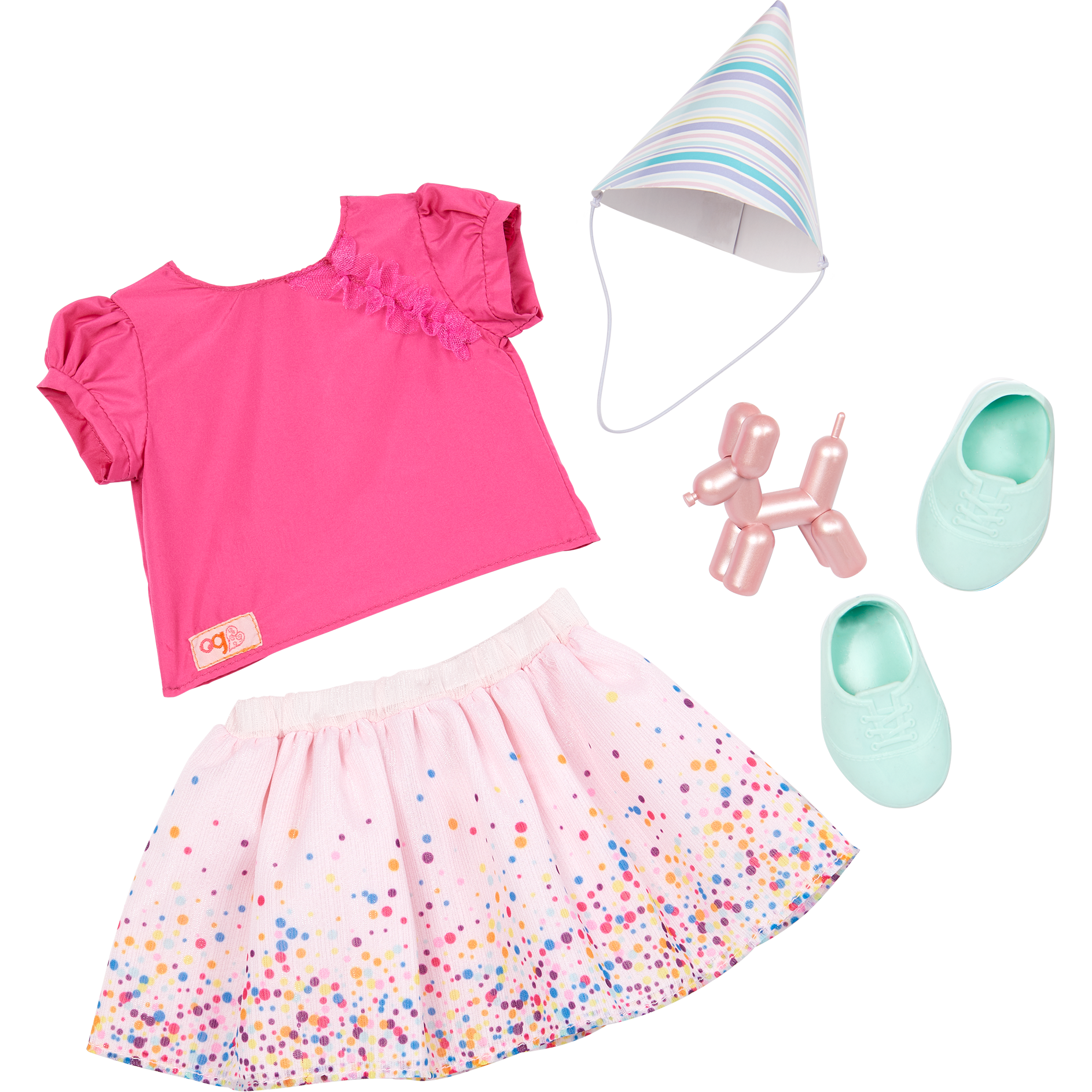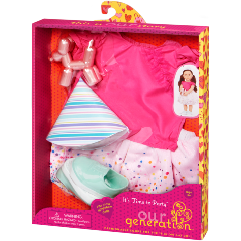 From birthday girl to party guest, the Our Generation It's Time to Party outfit will have your 18-inch doll bestie ready for a surprise celebration! Get them birthday-ready with the bright pink cap-sleeve top and add the confetti-inspired skirt to create a sweet, festive look. Then set the scene with the party hat accessory and Poodle balloon to kick off the big day! Your doll bestie will be so excited! This outfit has easy-open closures to quickly put on and remove, and it's compatible with most 18-inch dolls, outfits, and accessories.