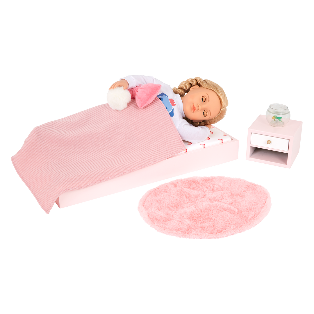 Reimagine your 18-inch doll's bedroom in beautiful style with the Our Generation Sweet Snuggles accessory set! Made of wood, the platform bed and nightstand can be arranged and rearranged in your favorite play areas to create endless stories. It can even be displayed beside your bed so you and your dolls can enjoy sweet dreams together! The additional decor items like the mattress, rug, blanket, and 3 pillows add an extra touch of chic. And the mini fish bowl treats your doll bestie to a friendly pet! For added storage, the nightstand opens to neatly store small accessories, with a below compartment to keep slippers or shoes tidy, too!