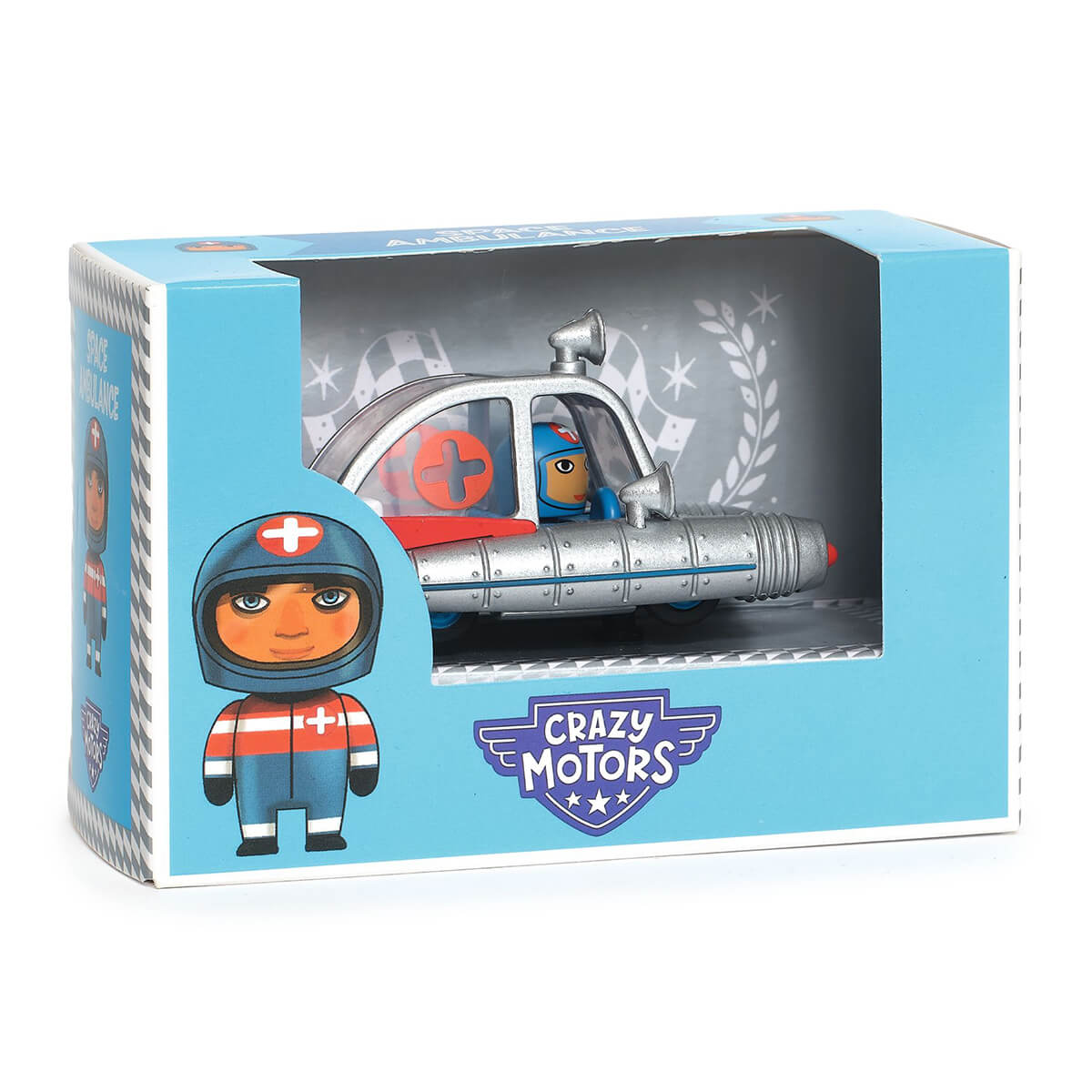 Crazy Motors Space Ambulance Car by Djeco. Metal racing car with realistic suspension and character racer. In the Crazy Motors collection there is an ambulance that travels through space to save all the Martians in danger!