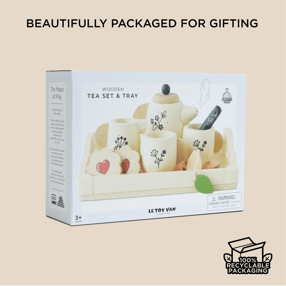 The serving tray adds convenience and portability, allowing your little ones to serve tea with ease. Crafted from sustainable wood, but also plastic-free, this set promotes eco-friendly play. It is the perfect toy for fostering creativity and imagination in little ones.