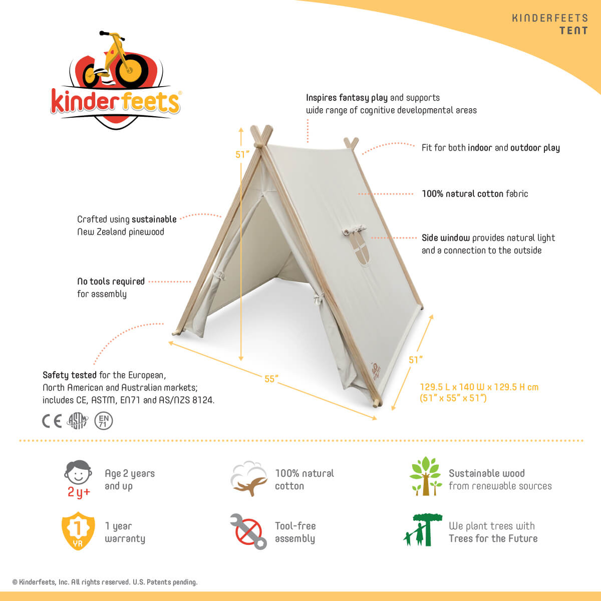 Explore a world of adventure with the Kinderfeets Tent! Crafted using sustainable New Zealand pine wood and natural cotton fabric, the tent inspires fantasy play and supports a wide range of cognitive developmental areas. A rounded side window provides natural light and a connection to the outside.