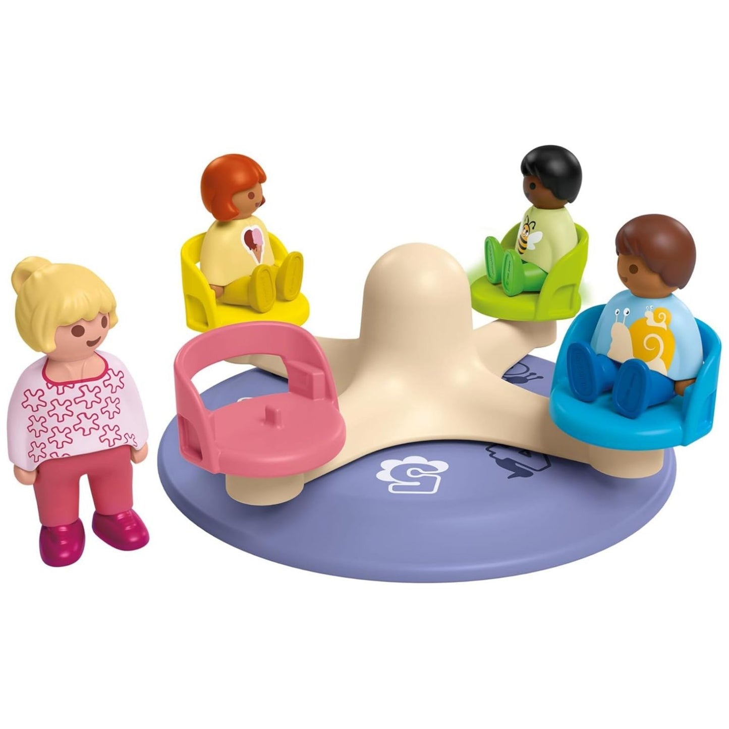 Ready for a journey into the world of numbers? With this set, your child will playfully explore the number space from 1 to 8. The number carousel offers space for four figures and plenty of fun! Let your child figure out who fits into which seat - the bright colors help. Where does the mother sit, where does each child sit? Are they all seated safely? Then the spinning fun can begin! Your child gives the carousel a strong spin using the turning knob in the middle. How fast does the carousel spin? When the carousel stops, each figure lands on a number. A great guessing game begins: What are the numbers? Which one is the smallest, which one is the largest? And which numbers are missing? Can your child count up to eight? Great, and now let's count backward!
