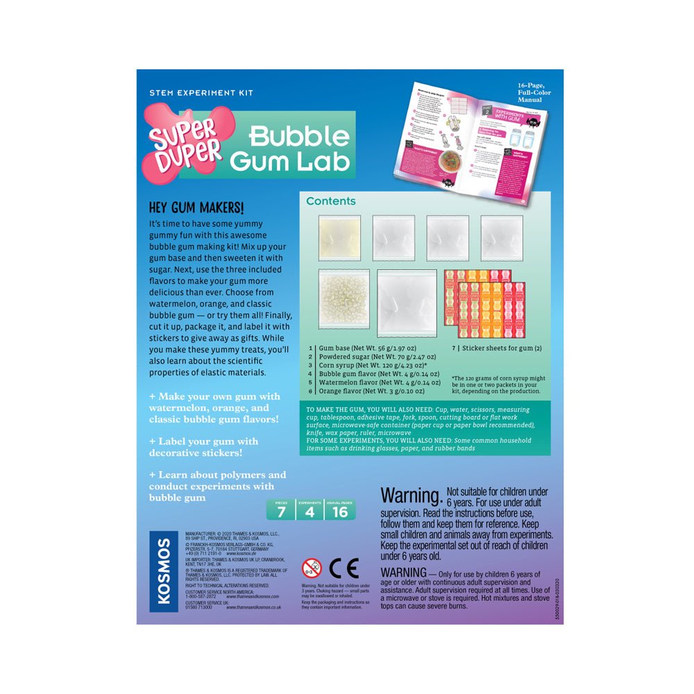 It's time to have some yummy gummy fun with this awesome bubble gum making kit! Mix up your gum base and then sweeten it with sugar. Next, use the three included flavors to make your gum more delicious than ever. Choose from watermelon, orange, and classic bubble gum or try them all! Finally, cut it up, package it, and label it with stickers to give away as gifts. While you make these yummy treats, you'll also learn about the scientific properties of elastic materials. Food ingredients included.