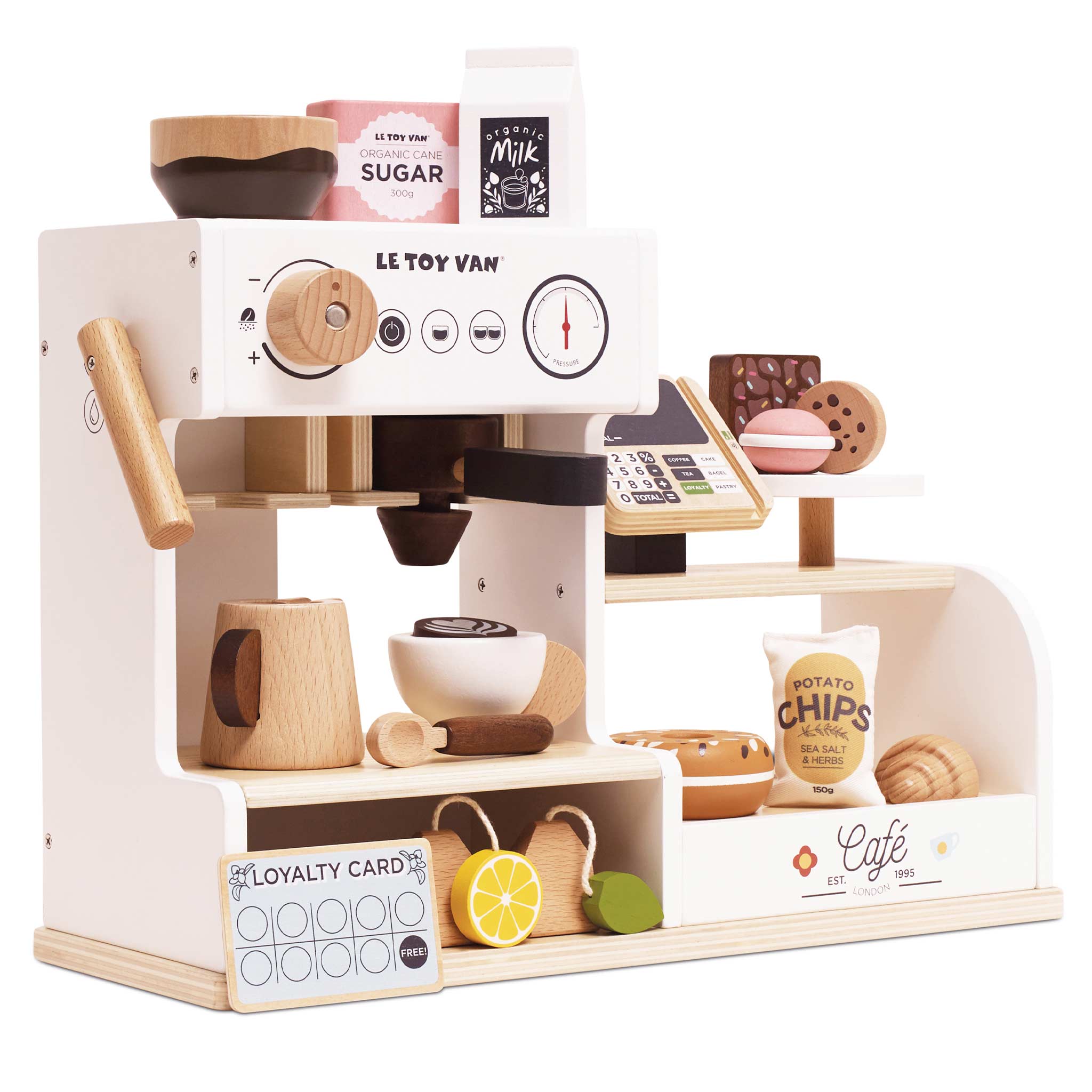 Whats included? Cookie, macaroon, brownie, croissant, bag of crisps, bagel, tea bag, lemon tea bag, milk carton, sugar, loyalty card, spoon, milk jug, mug, 2 latte art, coffee grinder, portafilter, milk frother, till chalkboard tablet, coffee machine dials and display shelving.