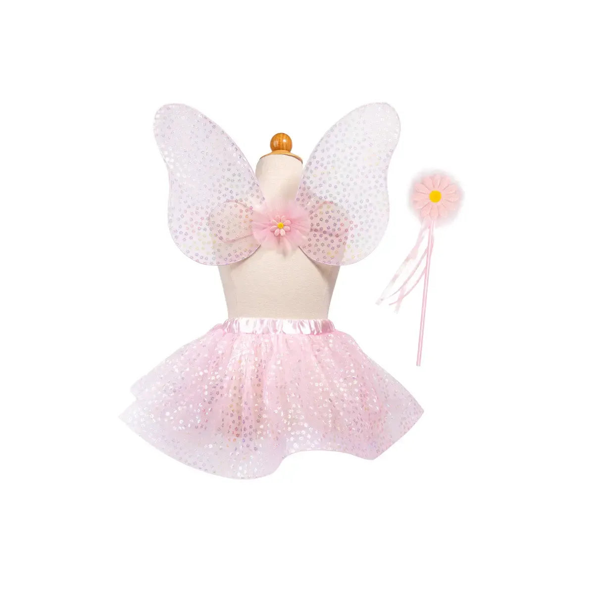 The fluffy pink tutu is covered in iridescent daisy details that shimmer and dance with each spin. Matching butterfly-shaped wings are sheer, sparkly, and feature the same enchanting daisies including one special bloom right where the wings meet in the centre, like a magical garden moment.