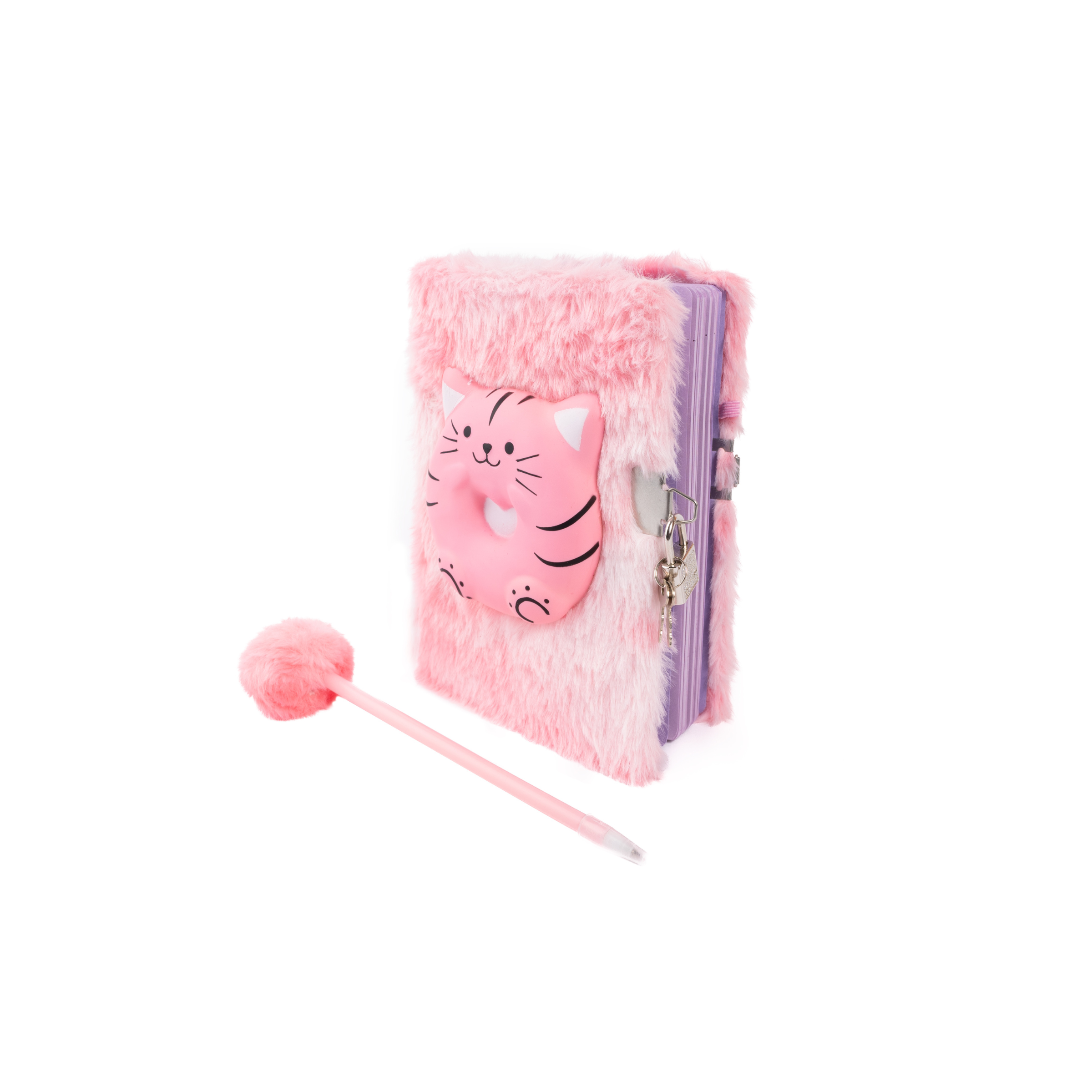 Soft, fuzzy, and packed with personality, these journals turn every note, doodle, and secret story into a snuggly creative adventure. Each set includes two plush tie-dye notebooks. The light Pink journal Features a big, squeezable cat squishy on the cover, perfect for stress relieving squeezes between writing bursts! The hot pink journal comes with an oversized squishy cat paw.Both covers are irresistibly soft to the touch, with playful textures that make them as fun to hold as they are to use. Both journals are delightfully fuzzy to hold and come with a lock and key, so every secret, story, and doodle stays safely tucked away. Plus, each journal includes a matching pen topped with a fluffy pom-pom for extra flair and fun!