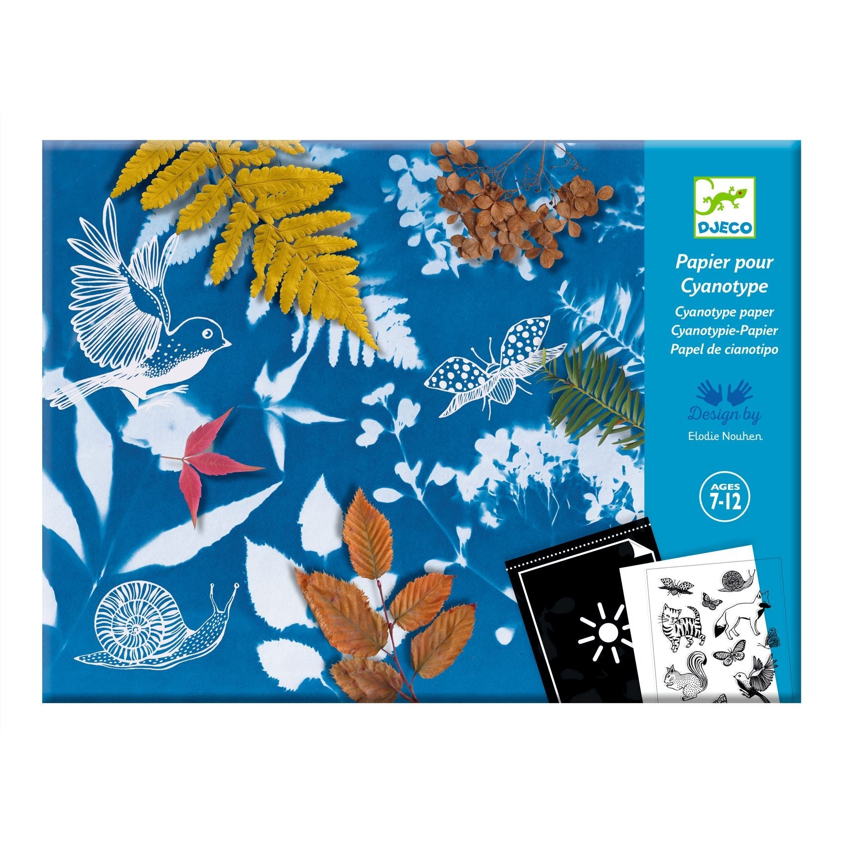 Compatible with Djeco cyanotype sets, these photosensitive paper refills can be used on their own with your own patterns or with the printed patterns provided. When exposed to sunlight, a negative of the patterns is produced on the paper. Then, all you need to do is rinse the paper in a clean water bath and watch as your creations appear on the blue background! Everything you need to create 8 delicate, poetic compositions.