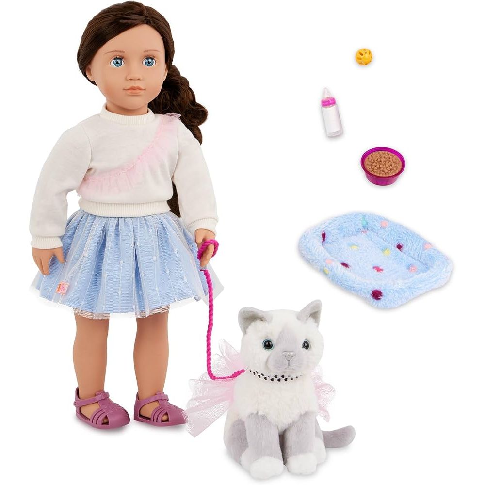 Our Generation doll Mindy and her pet kitty Pepper spark friendship and fun for animal fans! This 46 cm doll has a huggable soft body and lifelike features to delight doll fans during playtime. She has bright blue eyes that open and close with long, wavy brown hair to style in many ways. Kids can explore fun adventures with Mindy's 6-inch kitten, Pepper. Plus, they can care for this furry friend and keep her stylish with bonus play pieces like a tutu, a collar, a leash, a ball, a bowl of food, a bottle of milk, and a bed! Mindy wears a top with a pink tulle applique and a pleated skirt that kids can mix and match with other Our Generation doll clothes to create more cute combos. Makes a great gift for kids ages 3 years old and up, encouraging them to imagine their own unique stories.