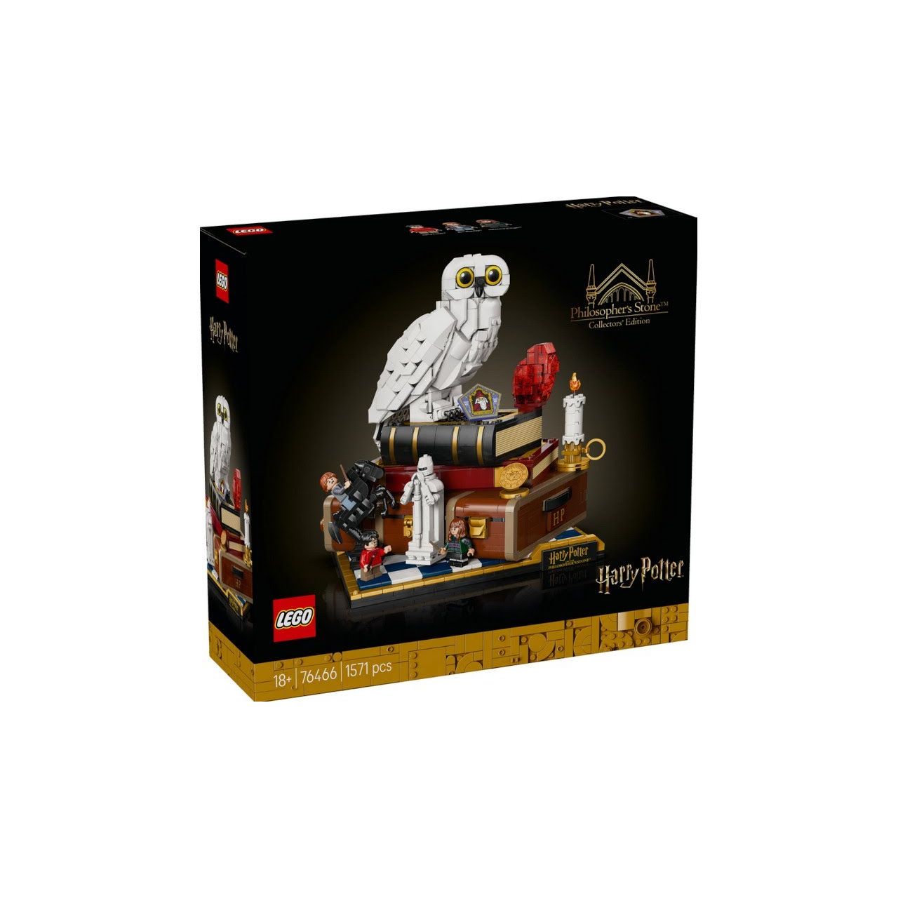 Build nostalgia for Harry Potter and the Sorcerer’s Stone™ with the LEGO® Harry Potter™ 25th anniversary Sorcerer’s Stone – Collectors’ Edition (76466). A top creative gift for adult Harry Potter fans, this collectible building set has fun functions, iconic characters and objects, plus microscale versions of classic scenes to inspire magical memories. Create the first LEGO Hedwig™ snowy owl figure with closed wings and display her next to the Sorcerer’s Stone on top of Harry Potter’s trunk. Add 3 LEGO Harry Potter minifigures – Harry Potter, Hermione Granger™ and ™ Ron Weasley™ – and items including a Chocolate Frog card and a Wizard Chessboard. Turn the 3 dials to turn Hedwig’s head, move the Queen on the Wizard Chessboard and blow the side off Harry Potter’s trunk to reveal the mountain troll’s bathroom attack scene. The other microscale scenes depict the Hogwarts™ Express and the 5 trials Harry faces to reach the Sorcerer’s Stone. Set contains 1,571 pieces.